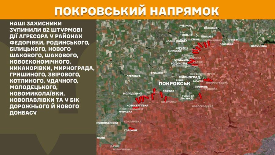 На Покровському напрямку наші захисники зупинили 82 штурмові дії агресора у районах Федорівки, Родинського, Білицького, Нового Шахового, Шахового, Новоекономічного, Никанорівки, Мирнограда, Гришиного, Звірового, Котлиного, Удачного, Молодецького, Новомиколаївки, Новопавлівки та у бік Дорожнього й Нового Донбасу.