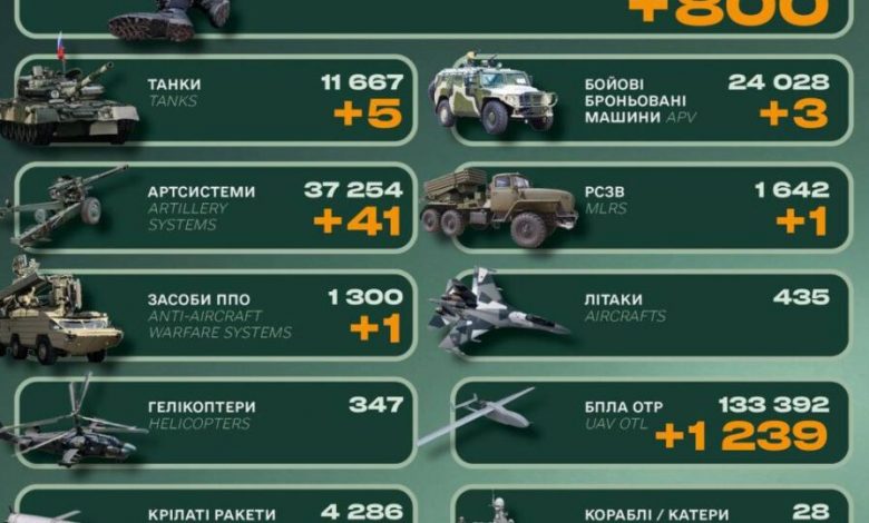 За минулу добу втрати армії країни-агресора становили 800 солдатів та 5 танків.
