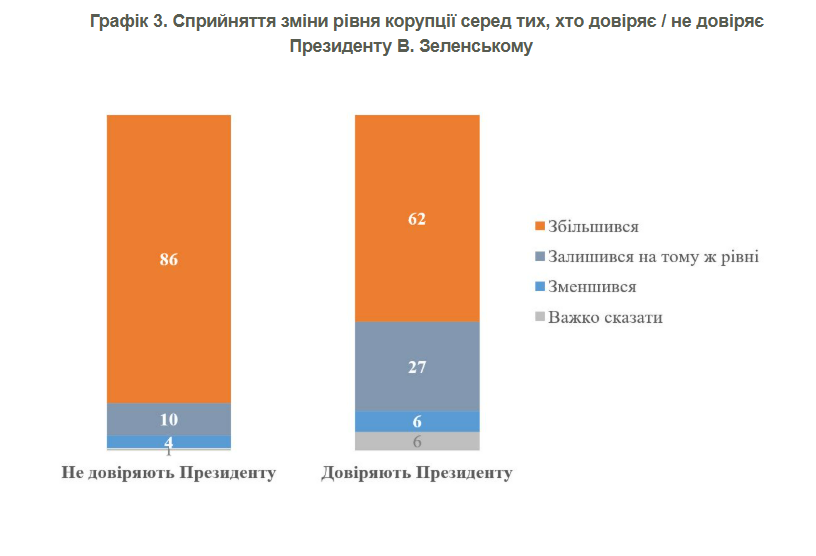 У всіх регіонах більшість респондентів відзначили зростання рівня корупції. Навіть серед тих, хто довіряє президентові Володимиру Зеленському, переважає переконання, що проблема посилилася під час війни.