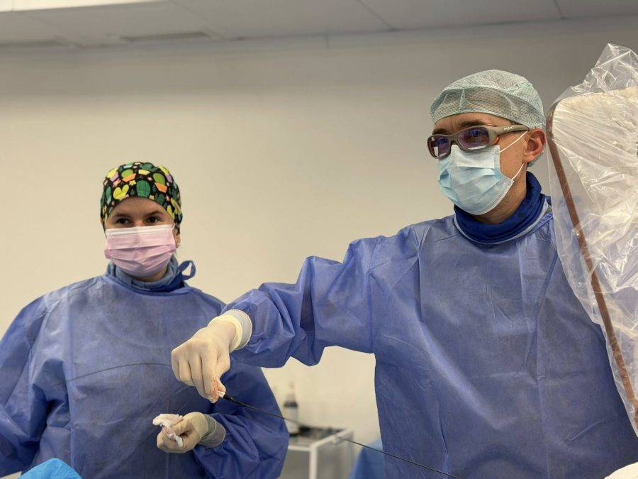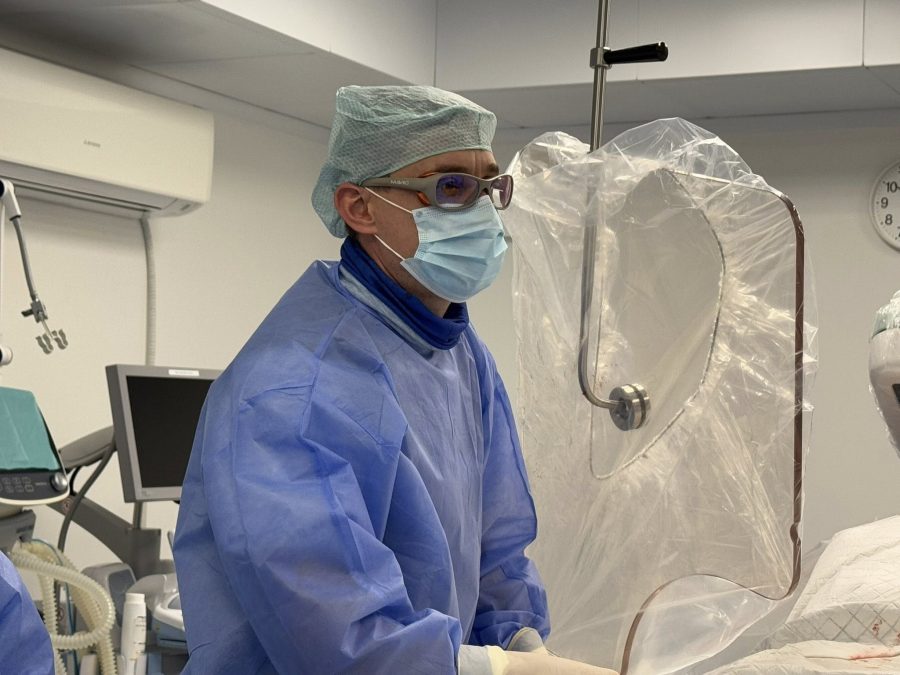 Причину інфаркту лікарі встановили вже під час коронарографії. У пацієнта було перекриття проксимального відділу передньої міжшлуночкової артерії, яка є однією з основних судин та постачає кров до серця. Хірургам потрібно було якомога швидше відновити кровотік. Для цього вони завели в судину катетер, доправили стент і розширили ним просвіт артерії.