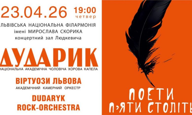 У четвер, 23 квітня, у Львівській національній філармонії відбудеться концерт «Поети п’яти століть» – подія, що народжується на перетині поезії та музики і продовжує традицію святкування Міжнародного дня книги як простору живого слова. Про це Львівському порталу повідомили у пресслужбі капели «Дударик».