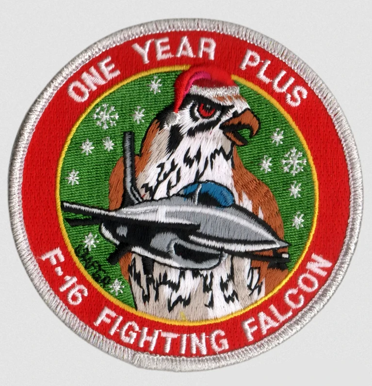 Ще один приклад святкової нашивки — зображення F-16 сокола у шапці Санти та з написом: «One Year Plus — F-16 Fighting Falcon».