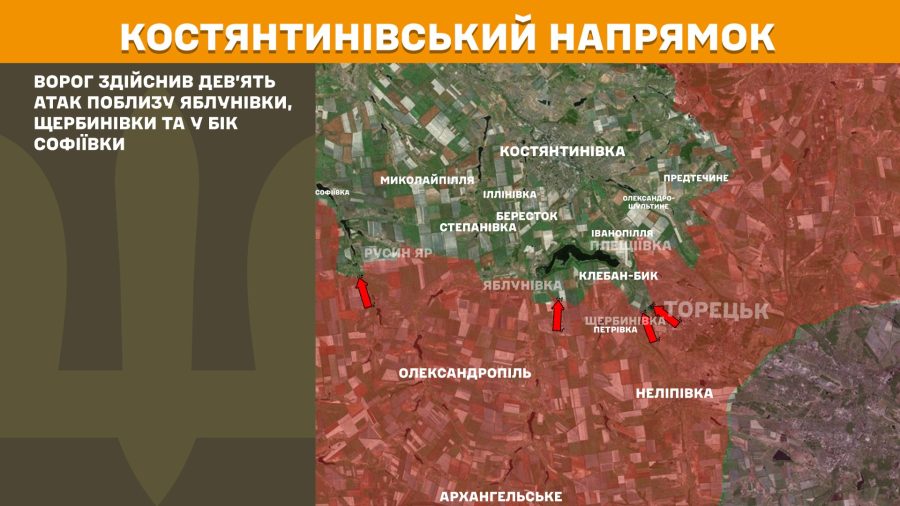 На Костянтинівському напрямку агресор здійснив дев’ять атак поблизу Яблунівки, Щербинівки та у бік Софіївки.