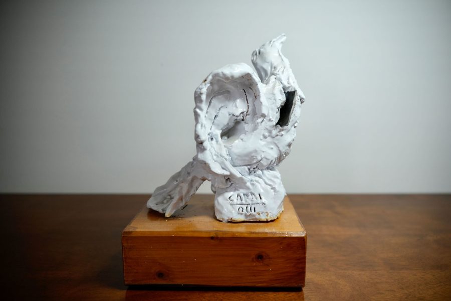 Мистецький виріб із кераміки зображає ніжного та крихкого голуба, враженого уламком металу від російської ракети, випущеної на Харків.
