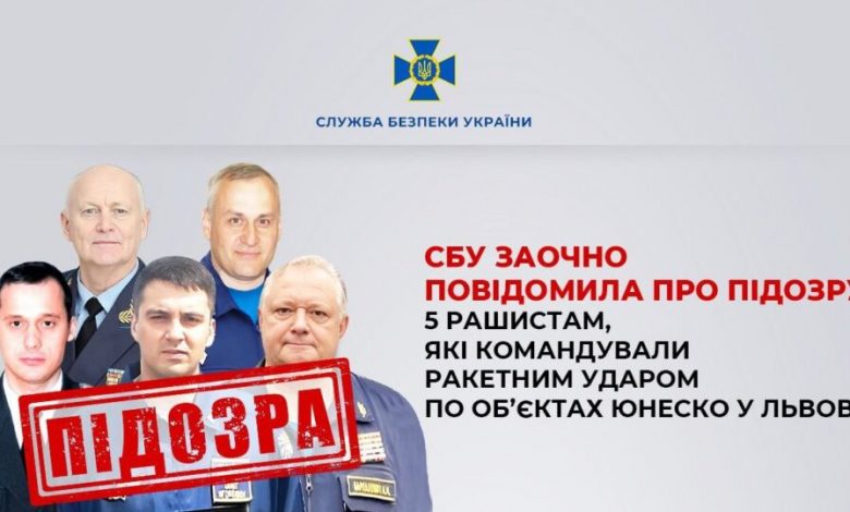 Служба безпеки України заочно повідомила про підозру п’ятьом російським військовим посадовцям, які причетні до ракетного удару по об’єктах ЮНЕСКО у Львові.