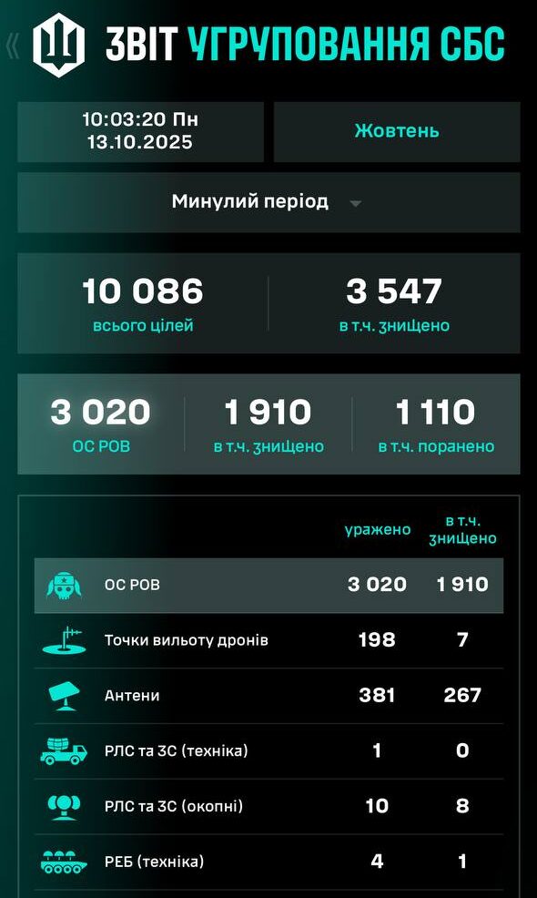 «Кожні дві хвилини жовтня горить ворожа ціль. Кожні шість хвилин жовтня знищується або калічиться один хробак. Перетнули відмітку 3000 верифікованих знищених/уражених пі**рів та 10000 ворожих цілей знищено/уражено силами Угруповання СБС за 12 з половиною діб жовтня», — йдеться у повідомленні.