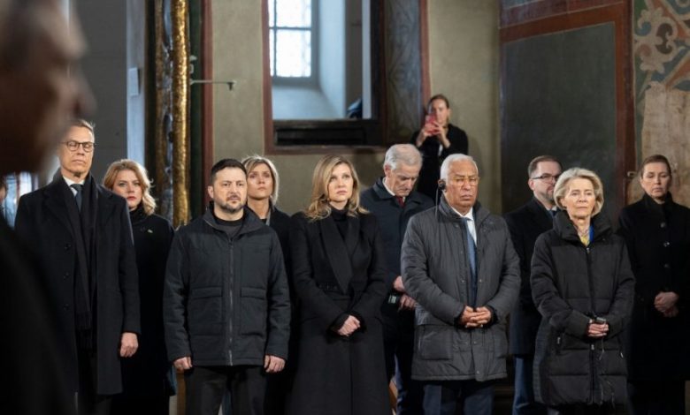 У день четвертих роковин повномасштабної агресії Росії проти України президент Володимир Зеленський та перша леді Олена Зеленська разом із європейськими лідерами, які прибули до Києва, помолилися в Софії Київській за українців та гідний мир в Україні. Про це повідомляє Офіс президента.