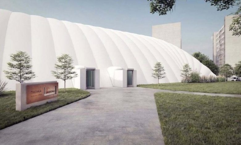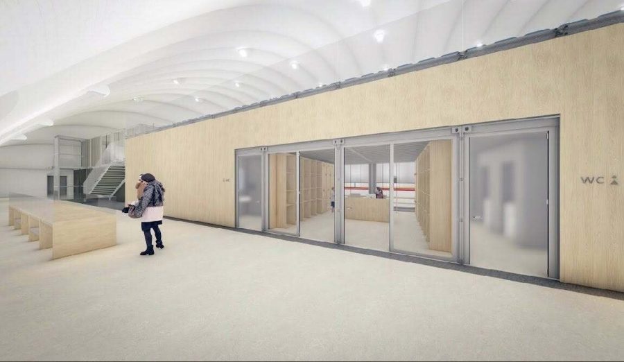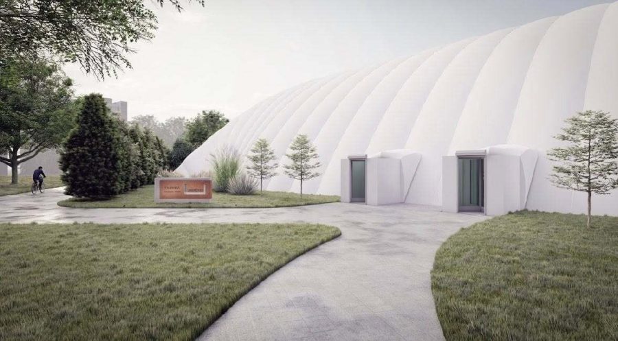 Проєкт критої льодової арени передбачає білу споруду з двома входами, оточену зеленими насадженнями та кущами