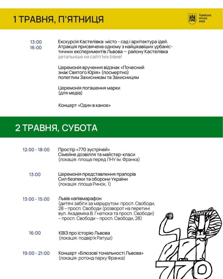 З 12:00 до 18:00 на площі перед ЛНУ ім. Івана Франка працюватиме простір «770 зустрічей». Там відбуватимуться сімейні активності та майстер-класи.