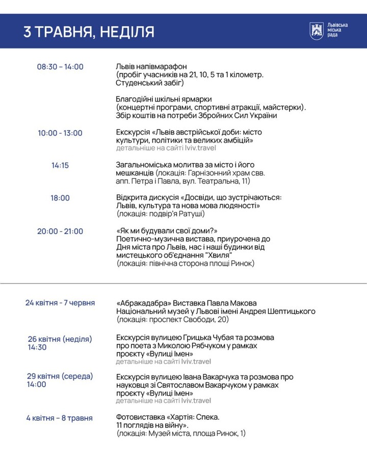 У п’ятницю, 24 квітня, у Львові презентували програму відзначення 770-річчя міста. Основні події триватимуть з 1 по 3 травня та охоплять культурні заходи, спорт, екскурсії, вшанування полеглих захисників і благодійні ініціативи. Про це Львівському порталу повідомили в пресслужбі Львівської міської ради.
