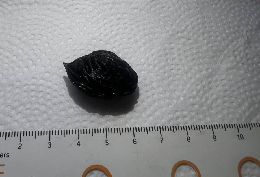 Персикова кісточка, яку витягли із кишківника пацієнта. Фото: Університетська лікарня ЛНМУ / Facebook