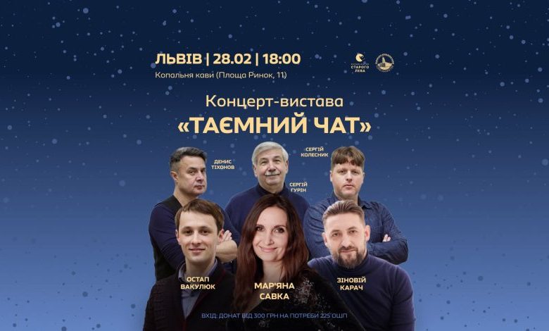 У суботу, 28 лютого, о 18:00 у камерній атмосфері Львівської копальні кави (площа Ринок, 10) відбудеться прем’єра концерту-вистави «Таємний чат» за однойменною п’єсою української поетки, видавчині і культурної діячки Мар’яни Савки. Цю п’єсу авторка написала у січні цього року – під час творчої резиденції «Обійми» в Ларнаці на Кіпрі, повідомляють організатори.