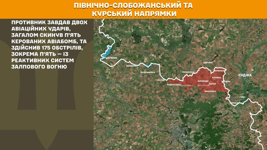 На Північно-Слобожанському і Курському напрямках противник завдав двох авіаційних ударів, загалом скинув п’ять керованих авіабомб, та здійснив 175 обстрілів, зокрема п’ять – із реактивних систем залпового вогню.