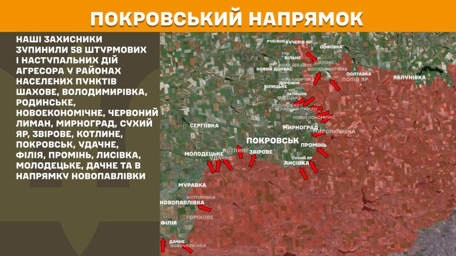 На Покровському напрямку наші захисники зупинили 58 штурмових і наступальних дій агресора у районах населених пунктів Шахове, Володимирівка, Родинське, Новоекономічне, Червоний Лиман, Мирноград, Сухий Яр, Звірове, Котлине, Покровськ, Удачне, Філія, Промінь, Лисівка, Молодецьке, Дачне та в напрямку Новопавлівки.
