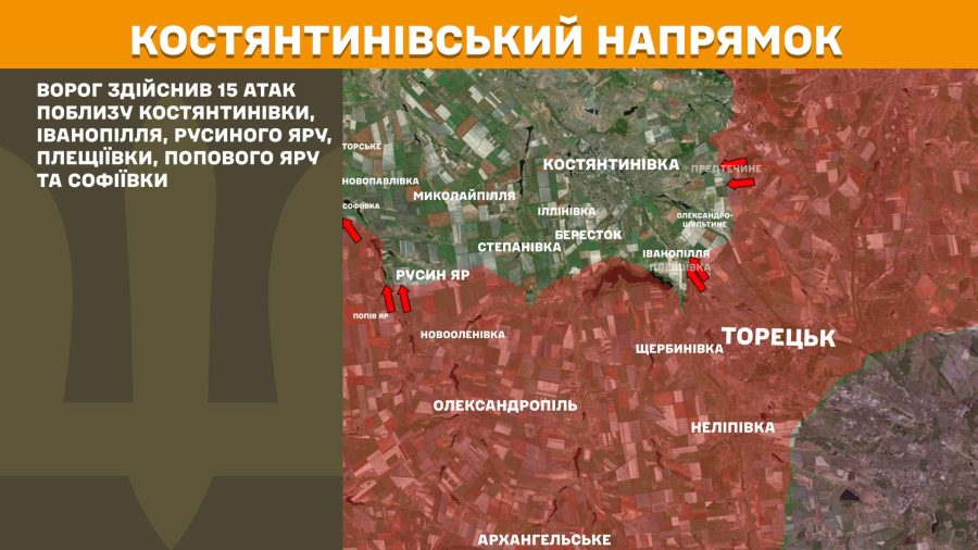 На Костянтинівському напрямку ворог здійснив 15 атак поблизу Костянтинівки, Іванопілля, Русиного Яру, Плещіївки, Попового Яру та Софіївки.