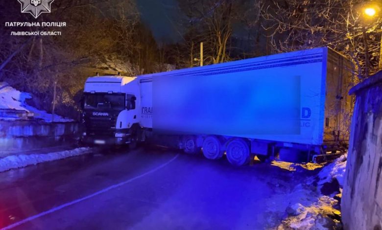 Вантажівка, що перекрила рух на вулиці Кривчицька дорога у Львові. Фото: патрульна поліція Львівської області