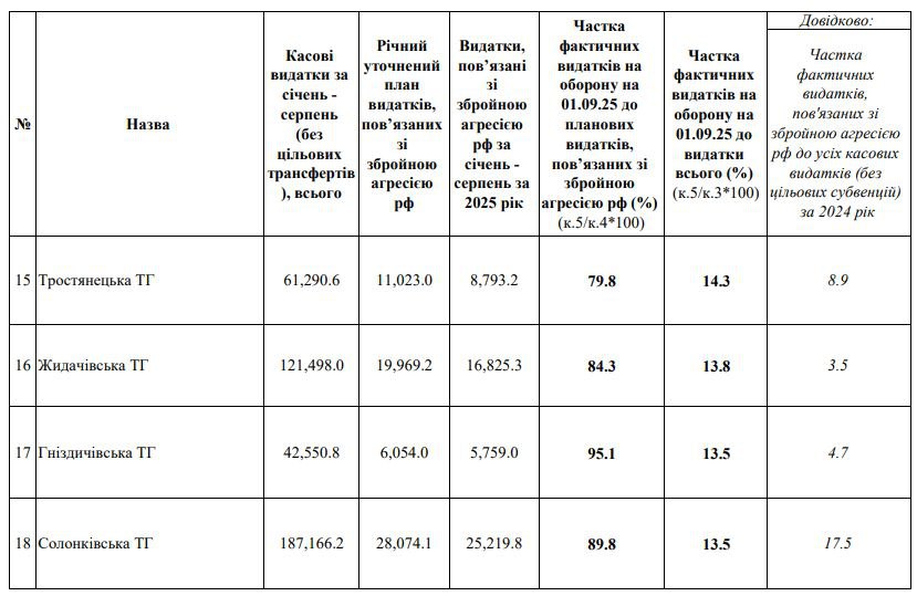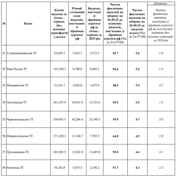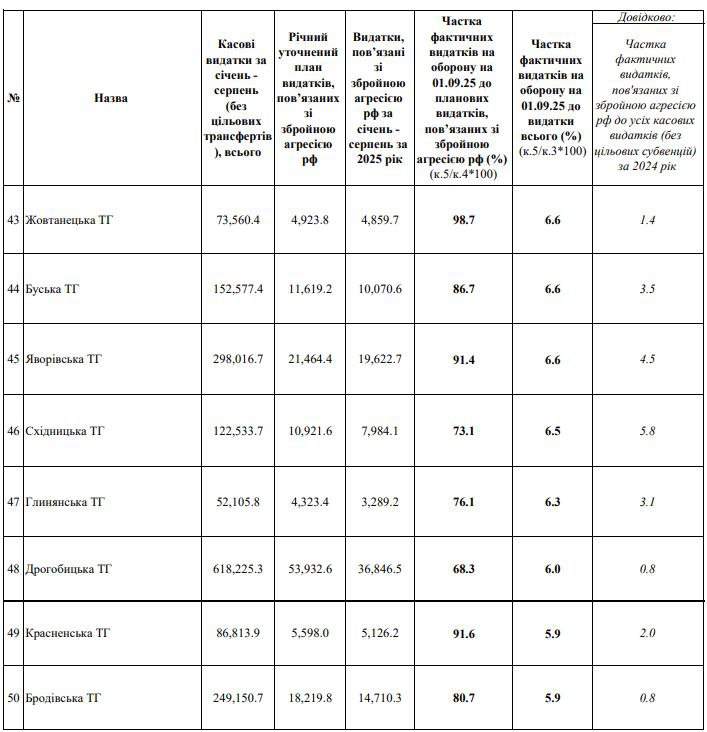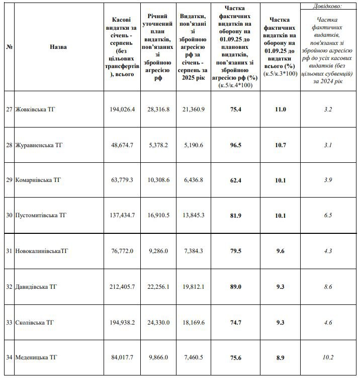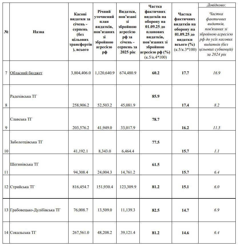 Фінансисти ЛОВА, підбиваючи витрати протягом восьми місяців, враховували частку фактичних видатків громад на допомогу ЗСУ (без цільових бюджетних трансфертів) до загальних видатків.