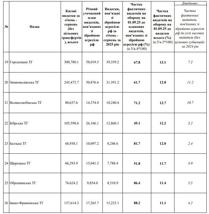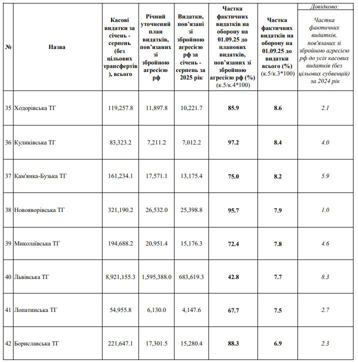 Повний перелік витрат на підтримку ЗСУ громад Львівської області станом на 1 вересня 2025 року виглядає так: