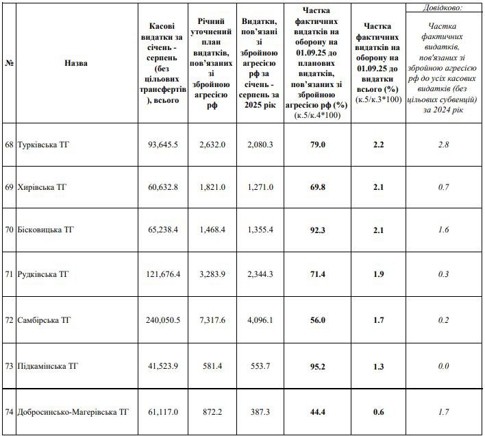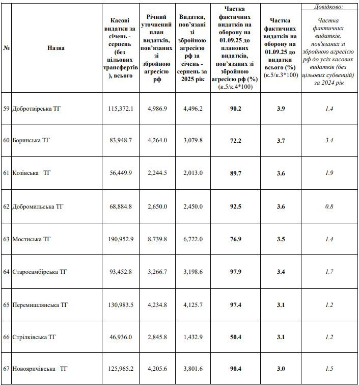 Традиційно найнижчий рівень підтримки ЗСУ демонструють у Добросинсько-Мегерівській громаді – 0,6% від бюджетних видатків, у Самбірській – 1,7%, у Підкамінській – 1,3%, Турківській – 2,2%, Новояричівській – 3,%, Рудківській – 1,9%, Бісковицькій – 2,1% та інших громадах.