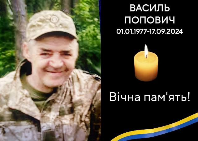 До рідного Стрия на щиті повертається 47-річний Василь Попович, який загинув під час операції у Курській області. Про це Львівському порталу повідомили у Стрийській міськраді.