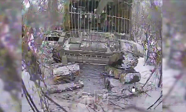 На кадрах видно ураження танка, який росіяни поставили на дерев’яний постамент, щоб підняти носову частину і збільшити далекобійність.
