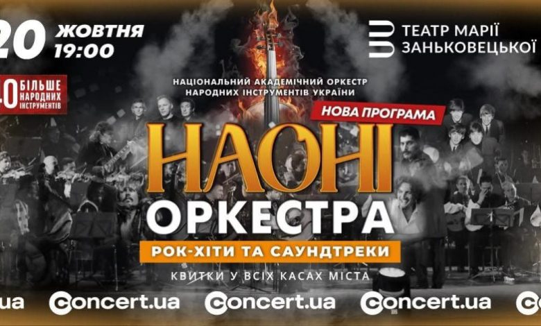 У понеділок, 20 жовтня, о 19:00 у Національному драматичному театрі ім. Марії Заньковецької відбудеться виступ Національного оркестру народних інструментів України (НАОНІ Оркестра) з програмою «Рок-хіти та саундтреки». Про це Львівському порталу повідомили організатори заходу.