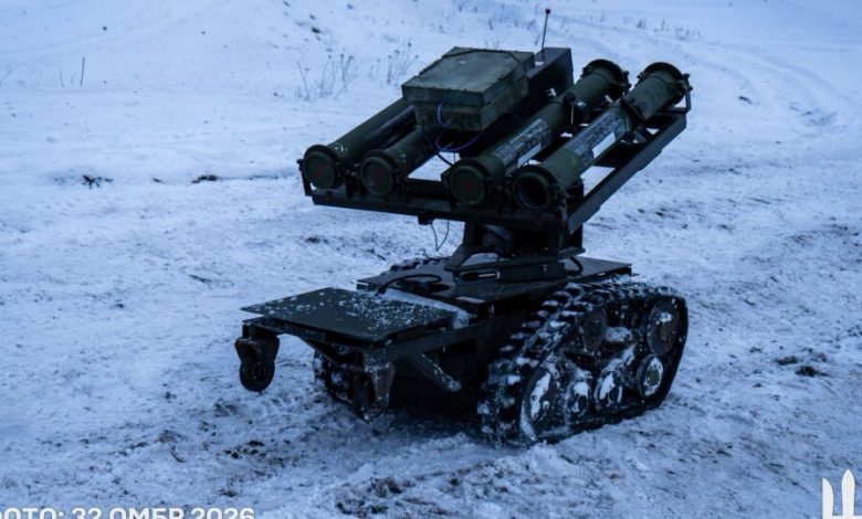 Наземний безпілотний комплекс рухається по снігу, оснащений кулеметною установкою та антеною для зв’язку. Його масивна рама й гусеничне шасі свідчать про призначення для ведення вогню або підтримки підрозділів без прямої участі оператора на позиції.