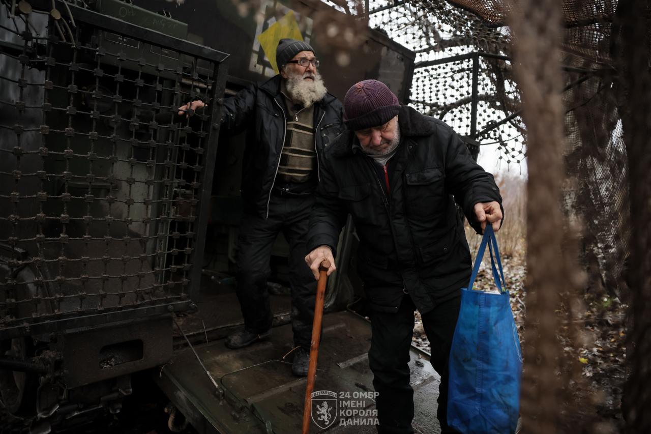 Олександр та Сергій хворі на цукровий діабет. Запаси ліків закінчилися. Коли безпечна евакуація стала неможливою, вивозити цивільних довелося військовим 24-ї бригади на бронетехніці.