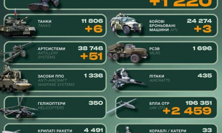 Окупаційна російська армія за минулу добу втратила 1220 одиниць особового складу і понад 50 артилерійських систем.