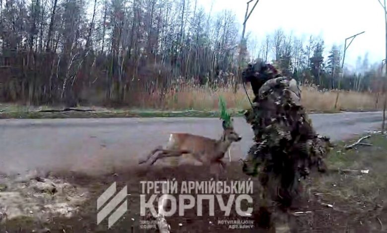 Як видно на оприлюднених кадрах, під час виконання бойового завдання бійці підрозділу «Примари» помітили перелякану тварину, яка в паніці кидалася у різні боки, намагаючись позбутися сітки, що обплела її роги.