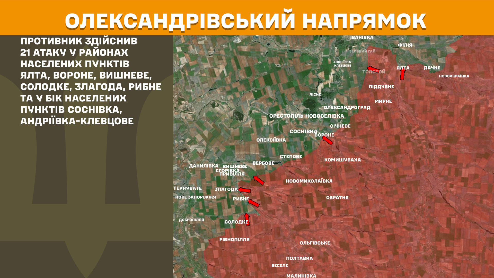 На Олександрівському напрямку противник вчора здійснив 21 атаку у районах населених пунктів Ялта, Вороне, Вишневе, Солодке, Злагода та Рибне та у бік населених пунктів Соснівка, Андріївка-Клевцове.