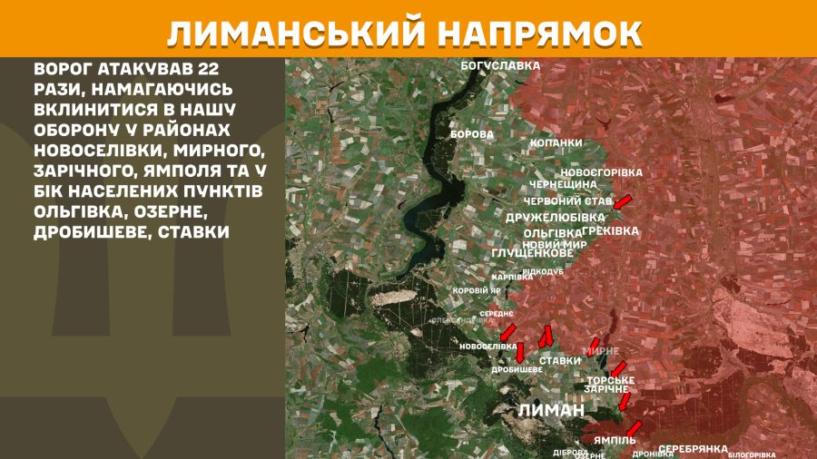 На Лиманському напрямку ворог атакував 22 рази, намагаючись вклинитися в нашу оборону у районах Новоселівки, Мирного, Зарічного, Ямполя та у бік населених пунктів Ольгівка, Озерне, Дробишеве, Ставки.