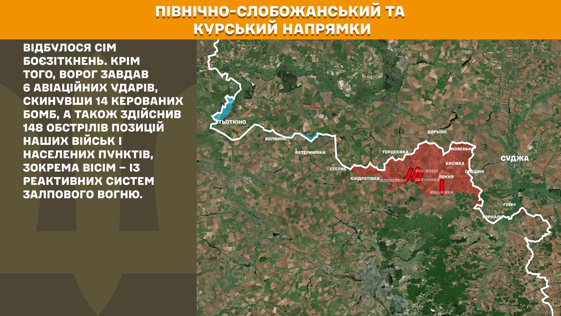 На Північно-Слобожанському і Курському напрямках минулої доби відбулося сім боєзіткнень. Крім того, ворог завдав 6 авіаційних ударів, скинувши 14 керованих бомб, а також здійснив 148 обстрілів позицій наших військ і населених пунктів, зокрема вісім — із реактивних систем залпового вогню.
