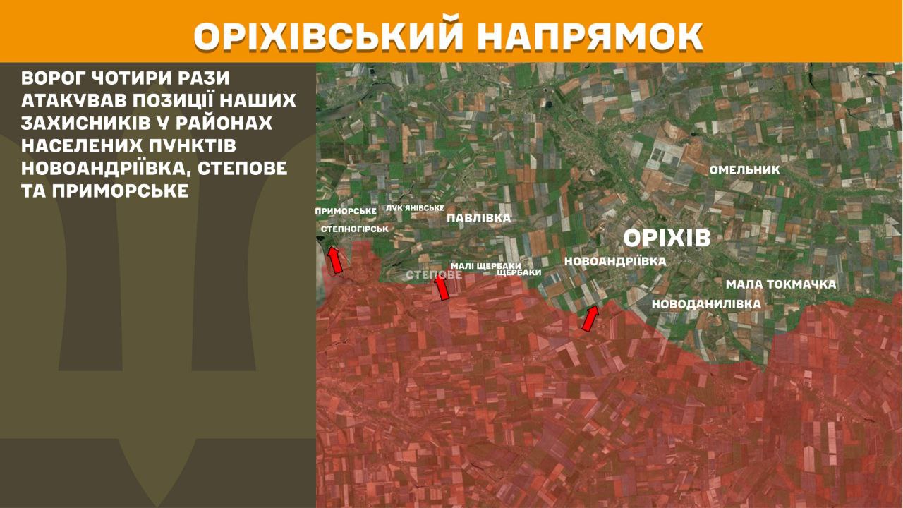 На Оріхівському напрямку ворог чотири рази атакував позиції наших захисників у районах населених пунктів Новоандріївка, Степове та Приморське.