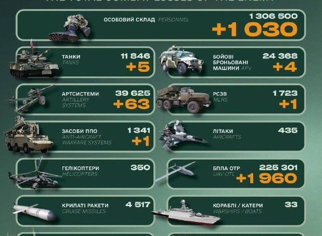 Окупаційна російська армія за минулу добу втратила 1030 одиниць особового складу та 5 танків.