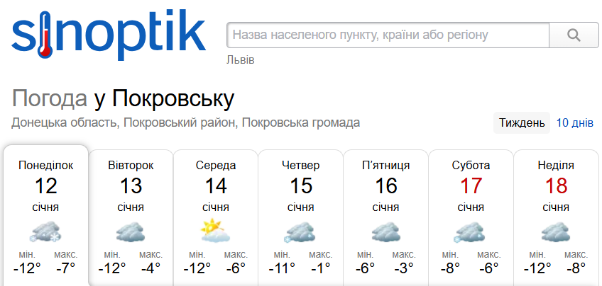 Зазначимо, що за даними Sinoptik, 12 січня і кілька наступних ночей температура повітря у Покровську знизилась до -12°C, денна – коливається у межах 4-7 градусів морозу.