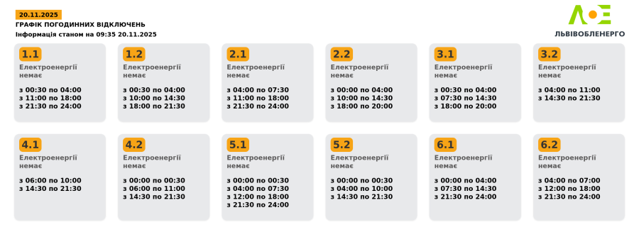 Раніше Львівський портал повідомляв, що 20 листопада графіки знеструмлень діятимуть в усіх областях України.