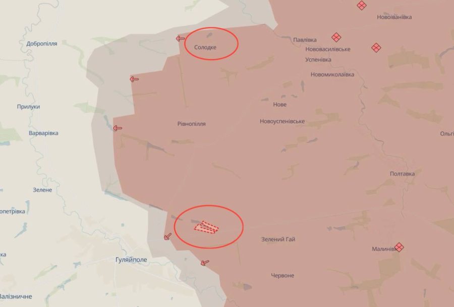 Окуповані Солодке та Затишшя на Запоріжжі. Скриншот мапи DeepState