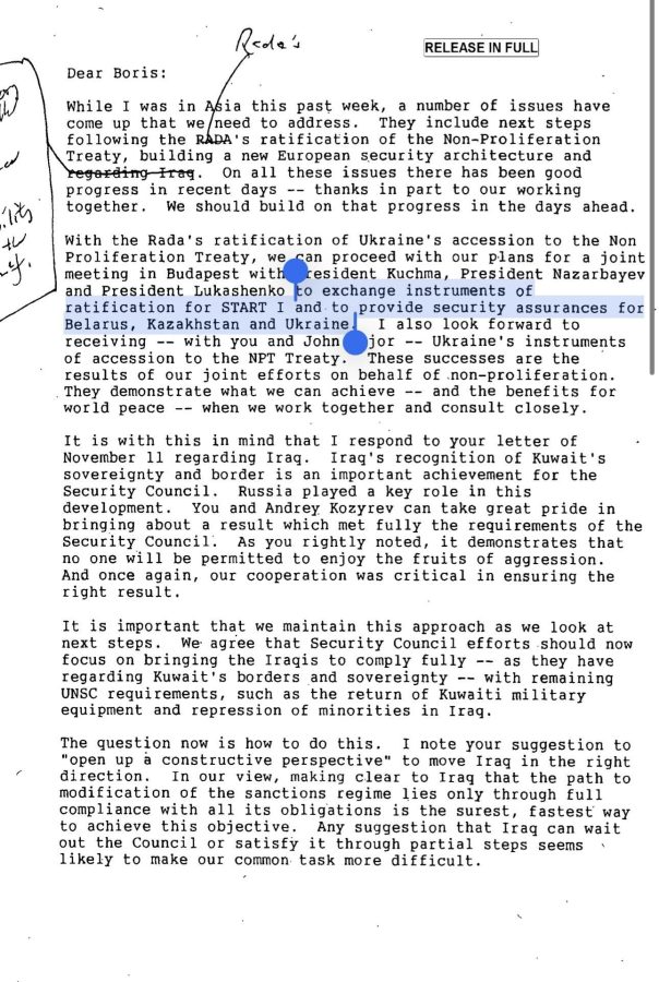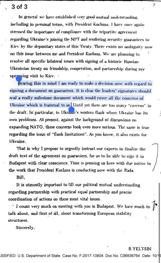 У своєму листі (див. фото) від 2 листопад 1994 р. Клінтону Єльцин пише про надання “гарантій” безпеки.