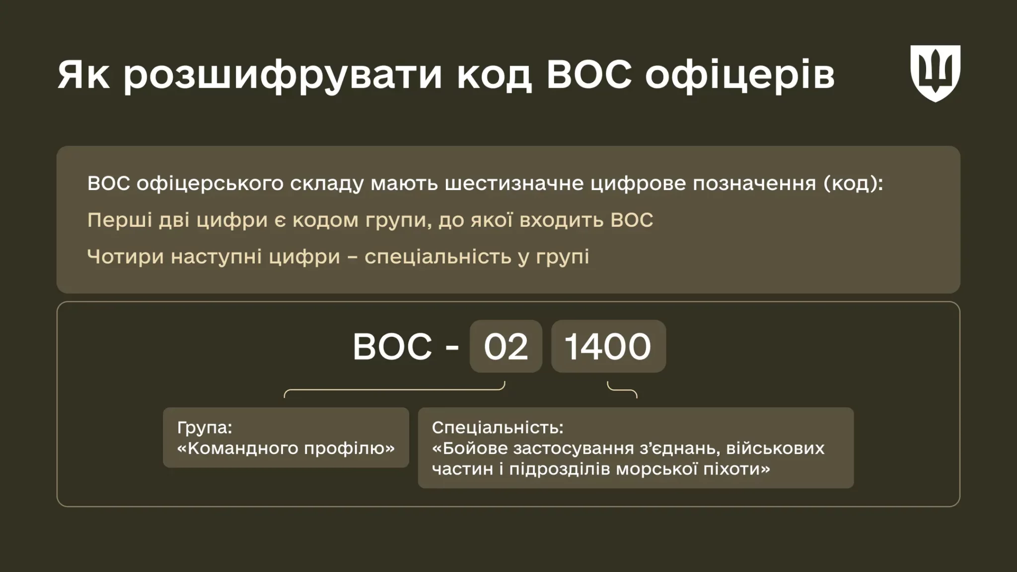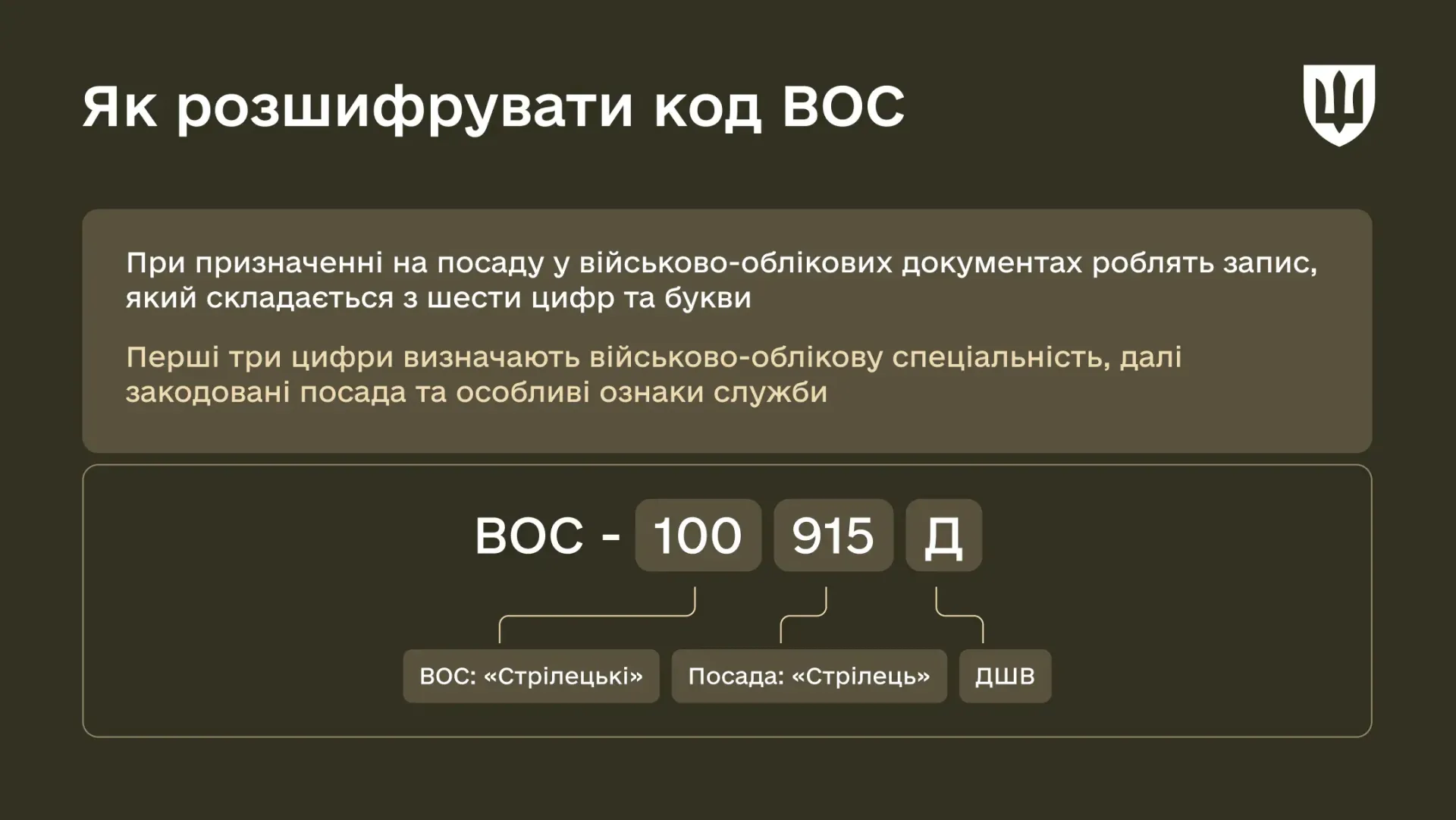 Наприклад, якщо у цивільному житті ви мали молодшу (середню) медичну освіту, то ви отримаєте ВОС-879 «Молодших спеціалістів з медичною освітою».