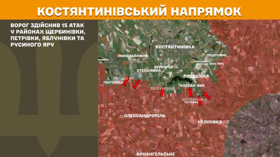 На Костянтинівському напрямку ворог здійснив 15 атак у районах Щербинівки, Петрівки, Яблунівки та Русиного Яру.