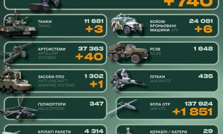 Втрати російських окупаційних сил за минулу добу становили 740 осіб та три танки.