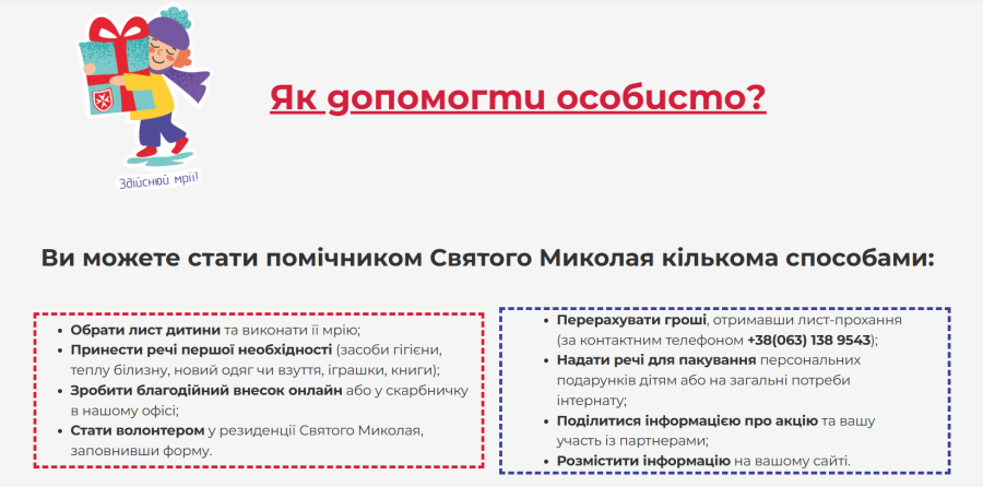 Також усі охочі можуть зробити фінансову пожертву на закупівлю подарунків і необхідних речей для малечі або ж стати волонтером проєкту «Святий Миколай дітям у потребі».