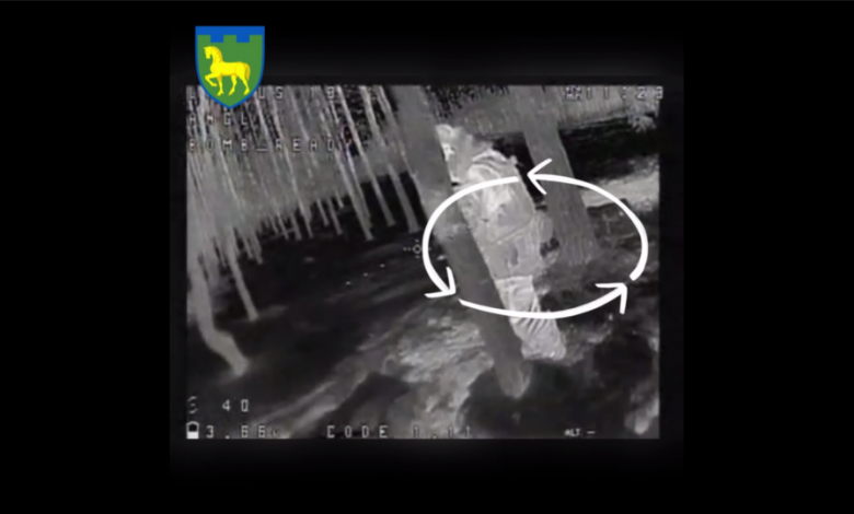 Загарбник сховався за деревом, але зробити повністю це не зміг, то був помічений та уражений нашими пілотами.
