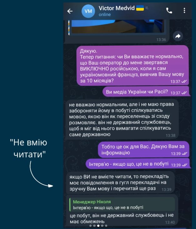 Також Ніколя Амбер опублікував у соцмережі скриншоти листування з керівником каналу. Там Медвідь пише, що оператор – «переселенець зі сходу», «не держслужбовець», тож має право говорити російською, а Ніколя «як громадянин іншої країни» не може на це впливати.