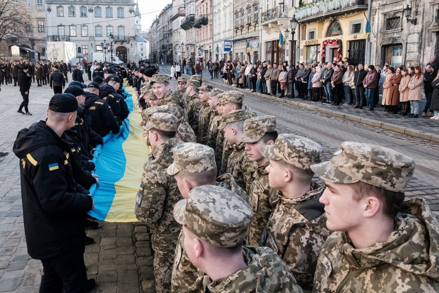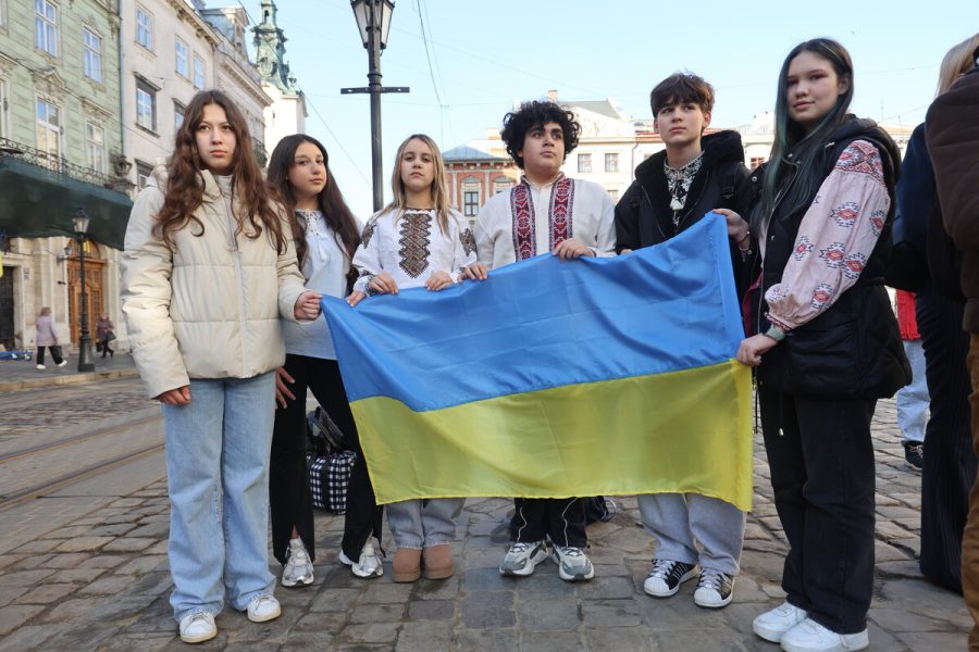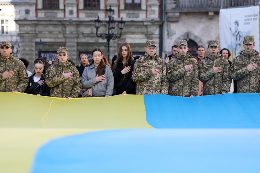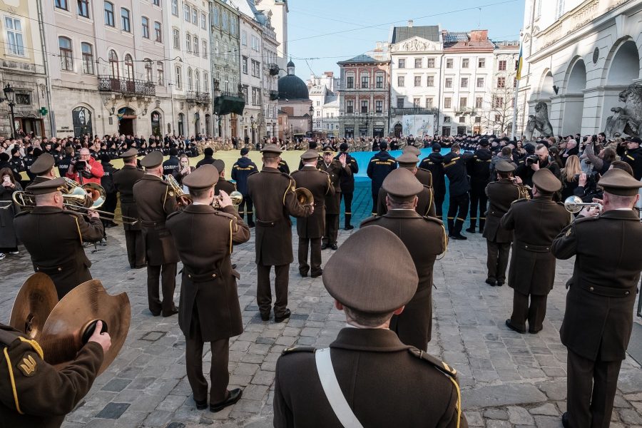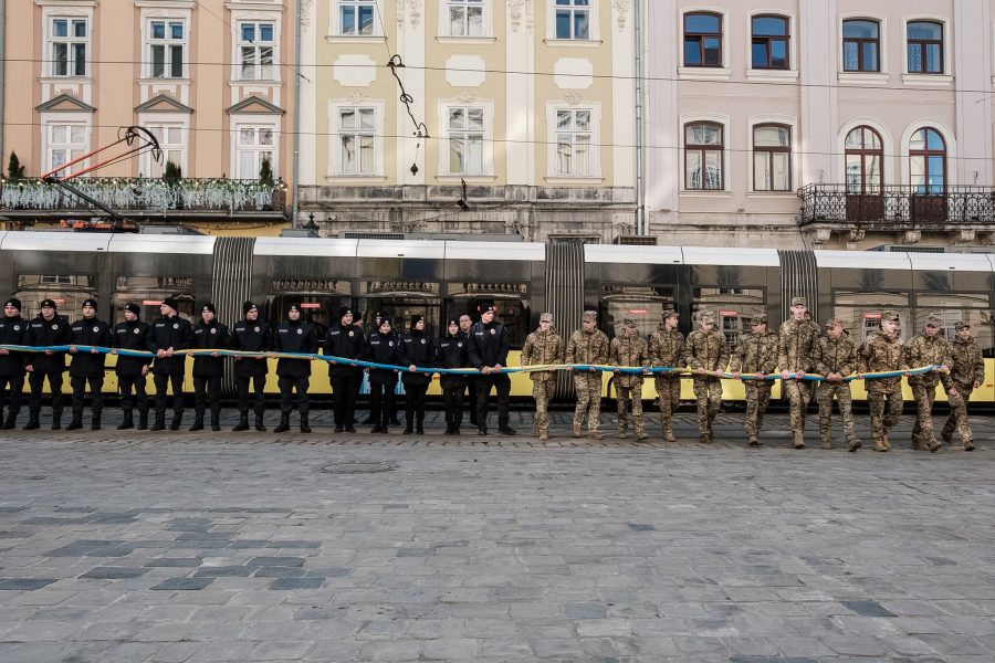 У Львові така традиція розгортати великий прапор України на центральній площі та спільно виконувати Гімн триває вже 13 років – із 2013 року.