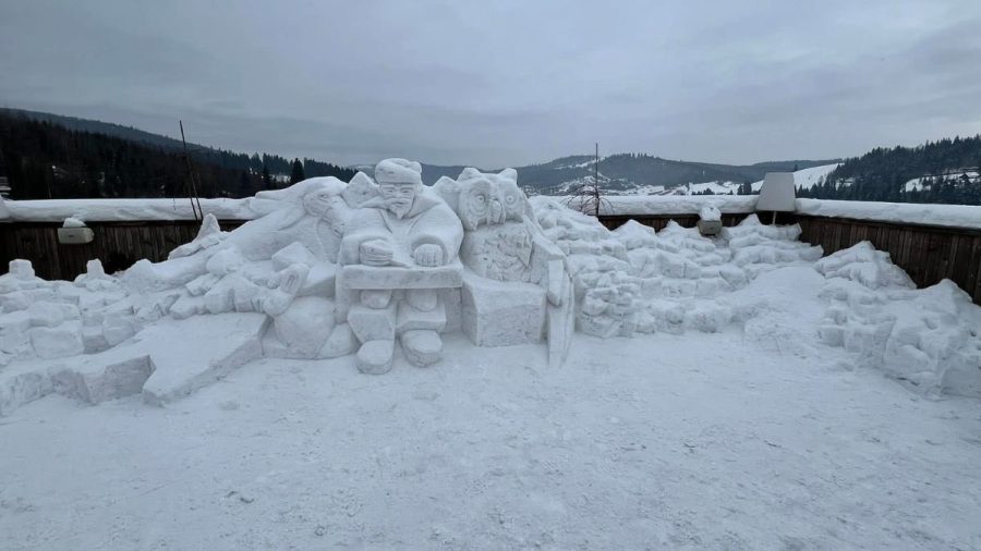На терасі одного з парків-готелів, на висоті сьомого поверху, ветеран війни, скульптор Василь Семко та художник Володимир Березний перетворили звичайний гірський сніг на масштабну художню композицію.