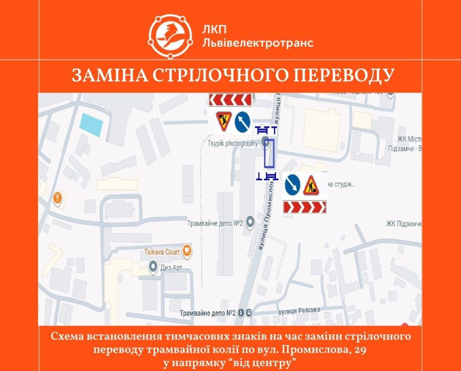 За інформацією ЛКП «Львівелектротранс», у ніч на п’ятницю, 17 жовтня, на вулиці Промисловій, 29 проводитимуть аварійні роботи із заміни стрілочного переводу трамвайної колії.