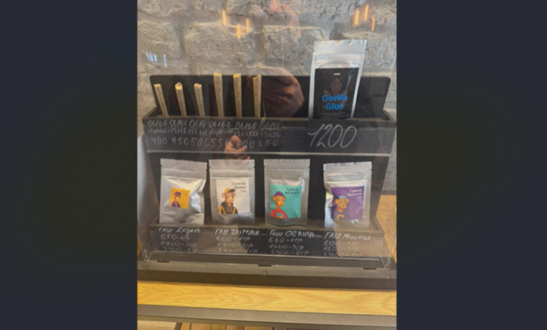 На фото видно зіп-пакети з невідомою подрібленою речовиною жовто-зеленого кольору. Крім того, у таких «сувенірних» магазинах відразу продають і пристрої для куріння.