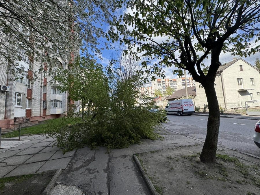 Як зазначили у мерії, вітер повалив дерева у Шевченківському районі міста, зокрема на вул. Хвильового, 14 та на перехресті вул. Шевченка – Величковського.